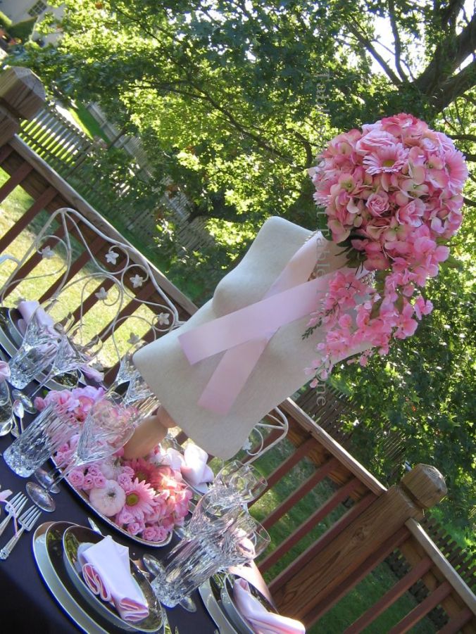 The table is dressed in a pure white full-length tablecloth from LinenTablecloth.com. The stretch white chair cover and pink satin sash are also from LTC. I wanted so much to tie the ribbon in the shape of the Breast Cancer Awareness symbol, but just couldn’t figure it out! Maybe by next year this time…! 🙂