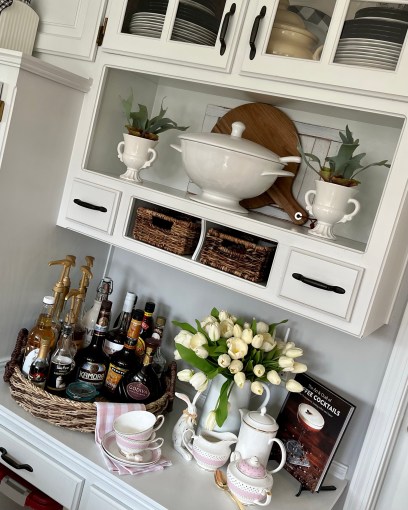 You may recognize this arrangement from my recent post, Bunny Pink Easter Luncheon. It found its way here to the breakfast bar for the season.