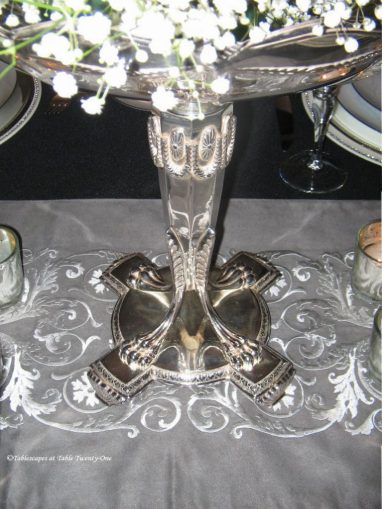At times I opt to keep the drama of a table confined to a single element. For this one, the WOW is in the waterfall of graceful florets (Nell Hills) spilling from a trio of tower vases.