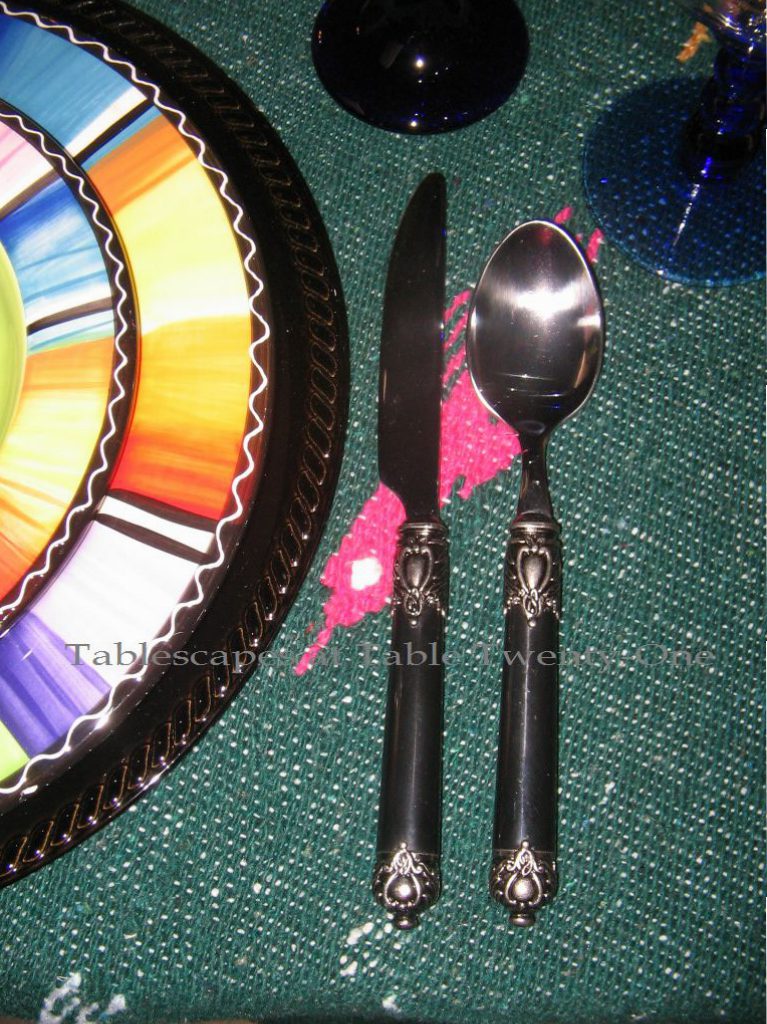 Flatware, rim shot collageWhen it comes to flatware, I’m more of a metal girl. For a fun table like this, though, I really like this fun hot pink flatware from Burlington. It really stands out against that fabulous black background and looks great alongside all three charger colors!