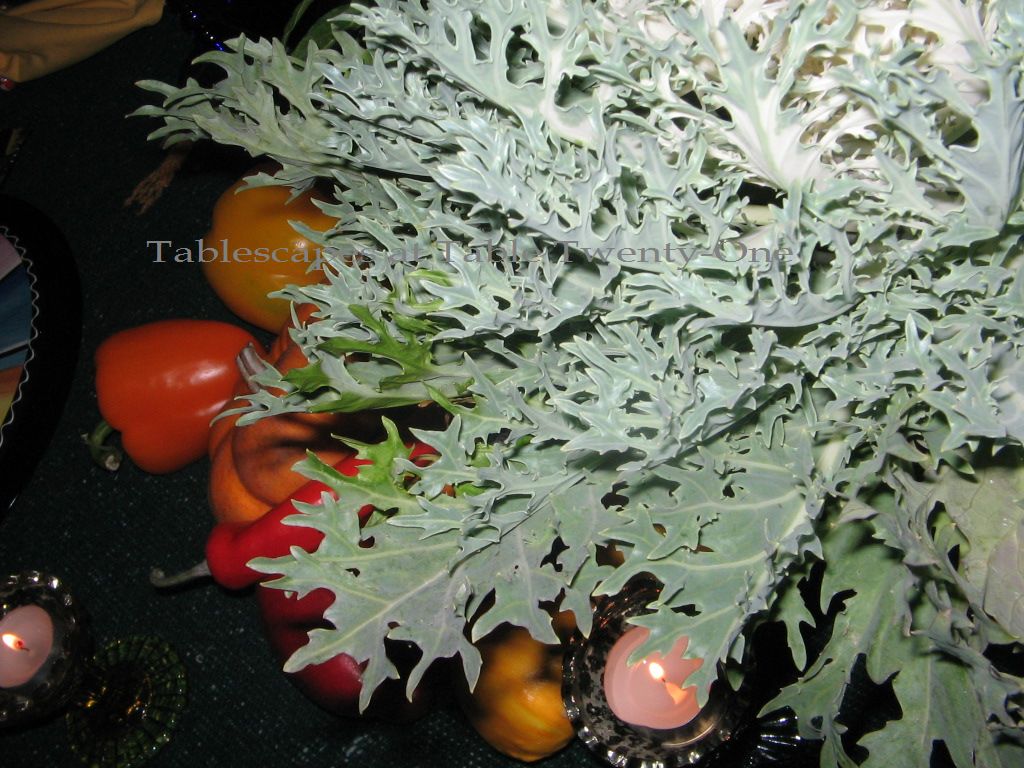 The centerpiece is a profusion of “Peacock White” flowering kale with fronds that remind me of a cactus, “Medusa” ornamental pepper plants, and succulents nestled in a hammered aluminum ice bucket. The nearly all-vegetable centerpiece is extended with various peppers, squashes and pumpkins. The mercury glass-lined raised tealights in gemstone colors are a World Market find.