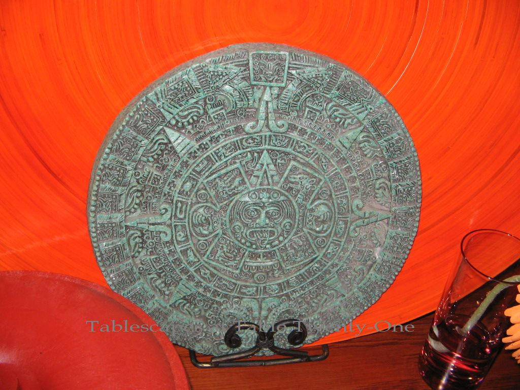 To dress up the buffet, I used one more bit of Tijuana memorabilia – a Mayan calendar – which is backed up by a huge orange platter to add depth, height, and vivid color.