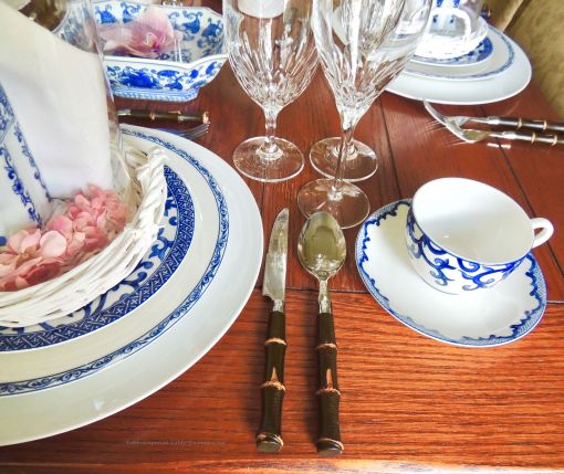 Although I have several blue & white dish patterns, this Ralph Lauren “Mandarin” is my favorite. This time around it is paired up with Godinger “Chelsea” crystal and black faux bamboo flatware. The extra special touch…gorgeous cloches from Nell Hills in Kansas City, Mo.!!! I wasn’t so thrilled with the white wicker tray, but Liz (Home & Gardening With Liz) convinced me to not spray paint them…yet! Under each cloche is a starched white linen napkin and a beautiful porcelain elephant from Pier 1 Imports. Small pink blossoms are added to break up the blue & white.