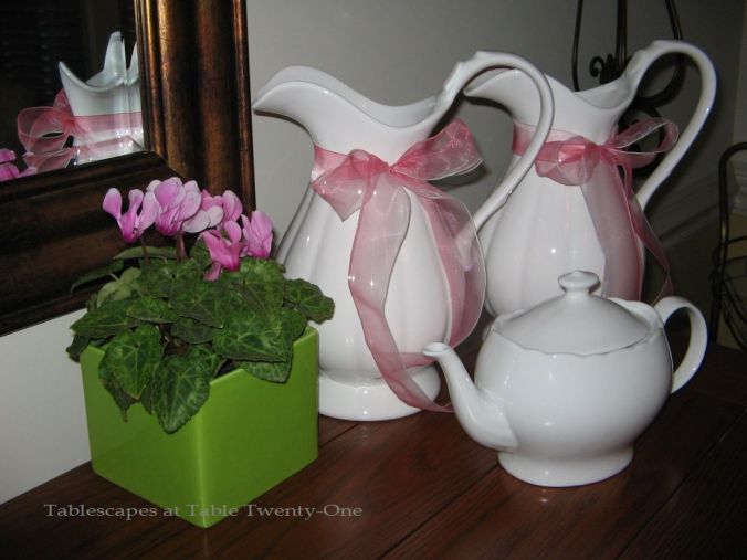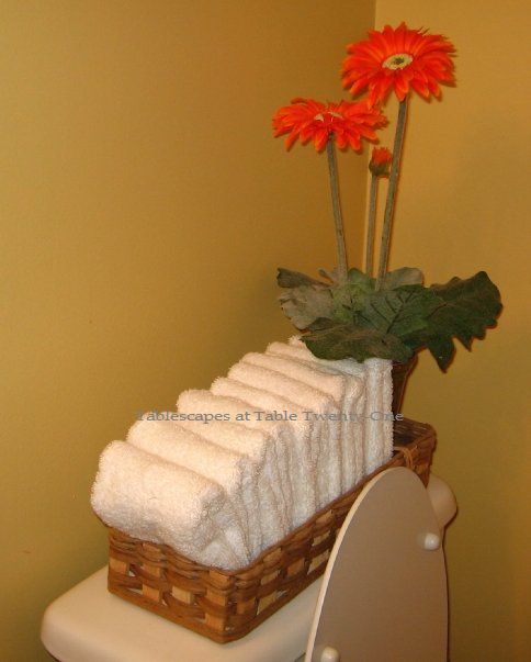The simply folded napkins are actually plush white wash cloths tied with green and red curling ribbon. I pick the cloths up at Sam’s Club to stock our bathrooms for use as hand towels like this: