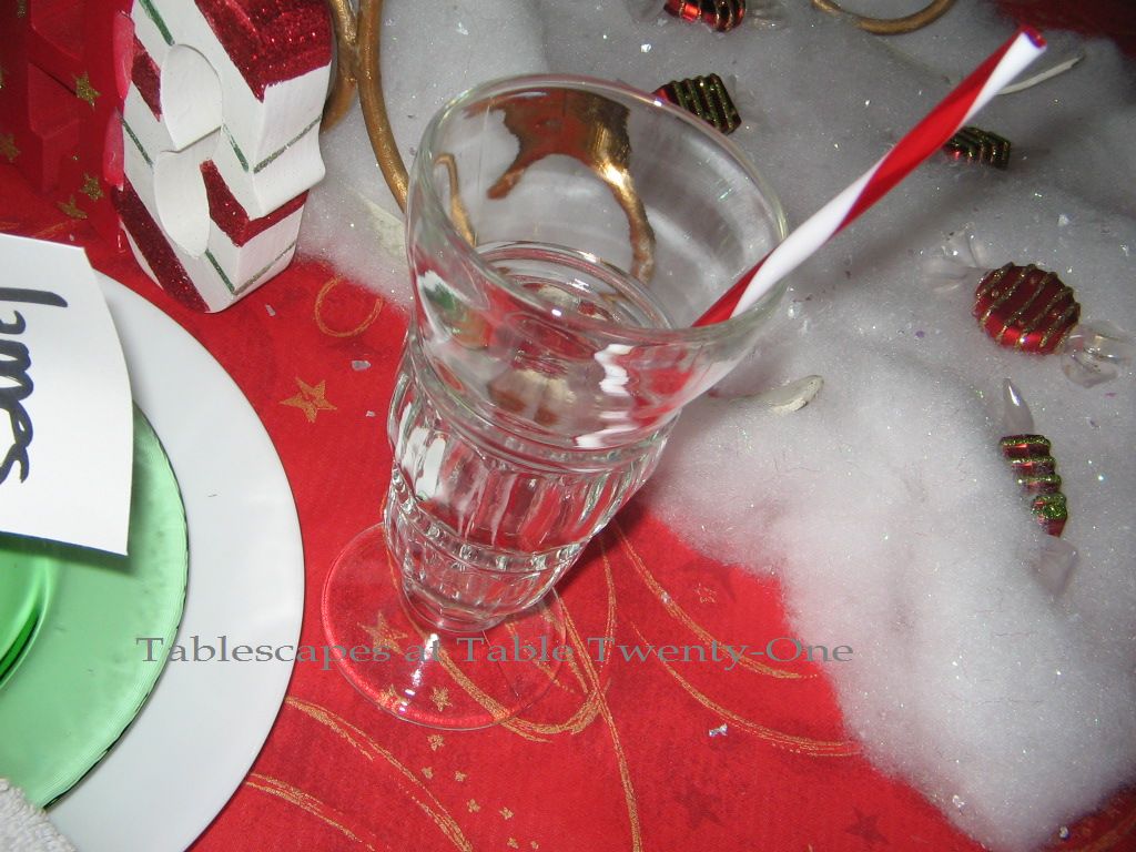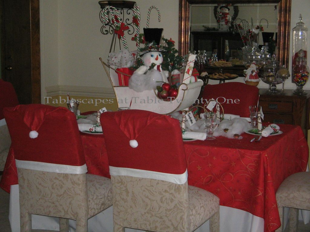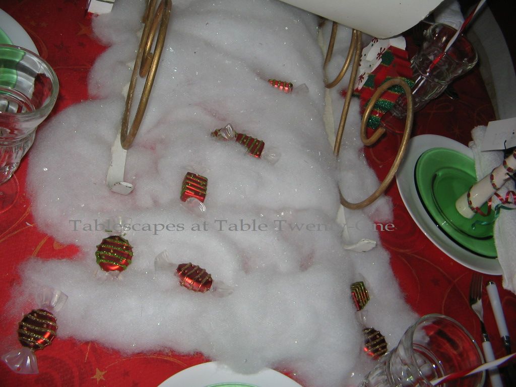 Keeping with my infamous motto of “go big, or go home”, I plopped this massive sleigh in the center of the table filled with a big ol’ snowman and all sorts of goodies that the kids can take home after the party. I bought the sleigh and snowman wholesale about 10 years ago. The giant red, green & white Christmas candy canes are from Dollar Tree (2011). Man, I love that place! I created a very different snowman tablescape last year that you can see by clicking here.