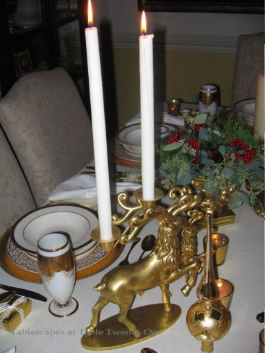 Other gold elements on the table include elegantly embellished tree toppers in coordinating designs and these fanciful reindeer candleholders I purchased years ago at a wholesale outlet.