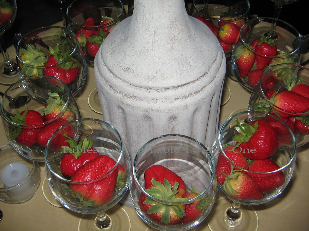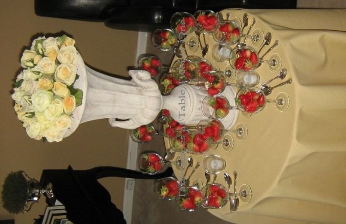 I wanted the table to resemble a Tiffany’s gift box, so I started with a Tiffany blue pintuck tablecloth from YourChairCovers.com. I glitzed it up with bling ribbon and scattered rhinestone brooches.