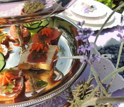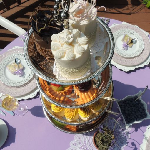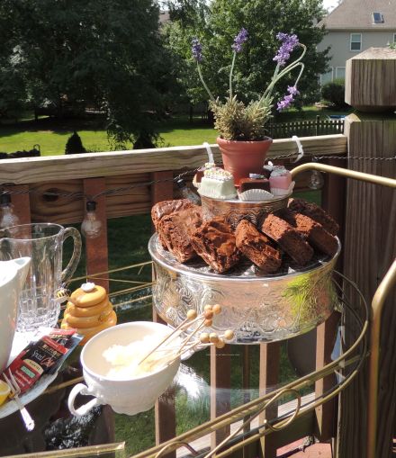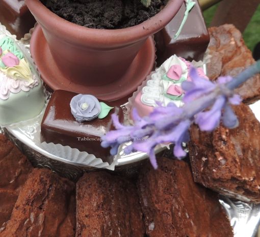 I stacked silver cake plateaus to display more sweets on the tea cart. Brownies on bottom, petit fours on top with another tiny pot of lavender.