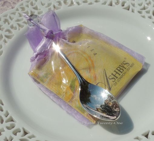 Each guest has a lovely take home favor of tea in a lavender organza bag with a an Austrian crystal-tipped silver spoon attached.