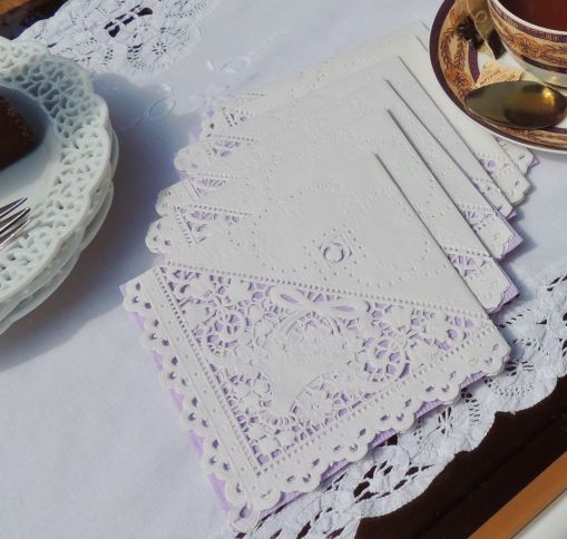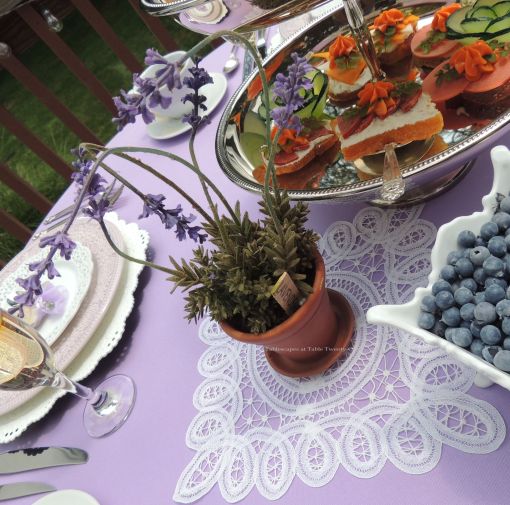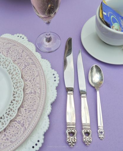 White lacy chargers from Michaels, lavender embossed lace dinner plates by Matceramica, and Pier 1 “Doily” salad plate are joined by “Royal Danish” sterling silver.