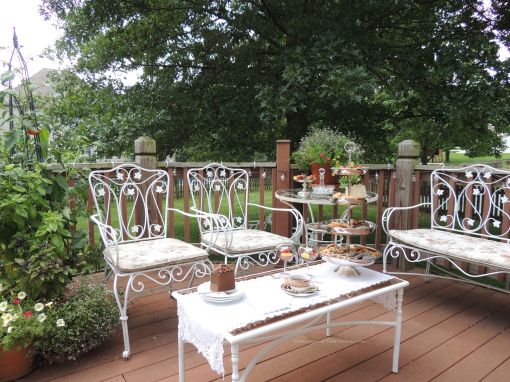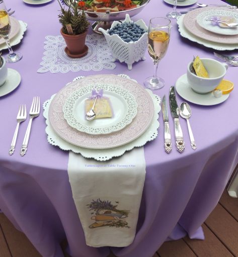 The deck is set for a ladies tea in lavender and white, starting with a full length round lavender tablecloth from LinenTablecloth.com.