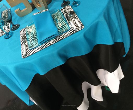This snazzy, jazzy guest table is all decked out in the Carolina Panthers’ team colors. Layering linens is a great way to bring color and interest to your table! The triple layer linens of Carolina blue, black and white are all from LinenTablecloth.com.