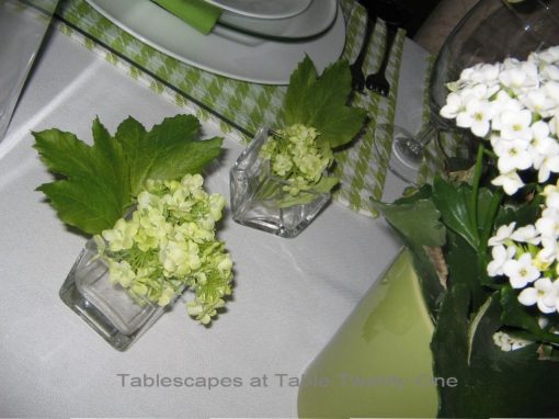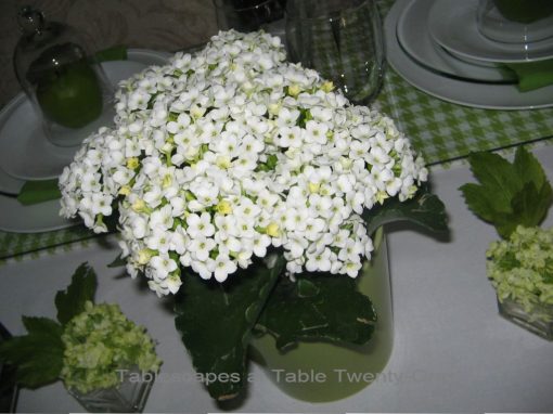 The second and third components of the centerpiece are small clear square votive holders with clumps of cheery green viburnum and a densely packed white kalanchoe plant from the flower nursery.