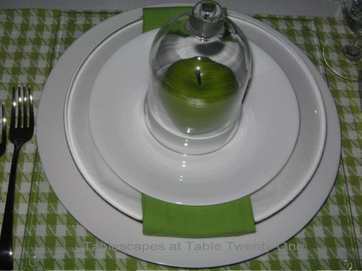 Spring luncheon tables are always so much fun to create! This one is great for a spring or summer luncheon, indoors or out. (It could also work well in celebration of St. Patrick’s Day with a little tweaking!) I started with a crisp white cotton linen. Next comes a gorgeous Pier 1 apple green and white cotton placemat with a fabulous houndstooth pattern. Just for fun and a little added dimension, a clear acrylic square is set atop the placemat. Next comes a simple white ceramic charger, a clear luncheon plate, and finally a plain white salad plate from Corelle. An apple green cotton napkin from Bed, Bath & Beyond adds color to the dish arrangement. The stack is topped off with a Granny Smith apple under a miniature clear cloche bell jar from Hobby Lobby. Clear everyday stems for water and limeade along with contemporary J.A. Henckels “Bellaserra” stainless complete the look.