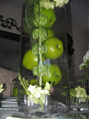 The centerpiece consists of three separate elements. First, for height, is a pair of clear square floral cylinders filled with Granny Smith apples and fresh Bells of Ireland, topped with a puffy green-tinged hydrangea head. I have used faux hydrangea and apples here for demonstration purposes, but the real thing looks absolutely incredible! If you go all fresh (and I sure hope you do!), fill the container with water to totally submerge the apples and Bells of Ireland stem. Submerged fruit and floral arrangements are so cool!!!