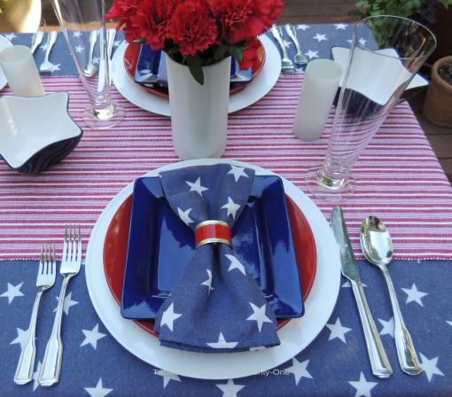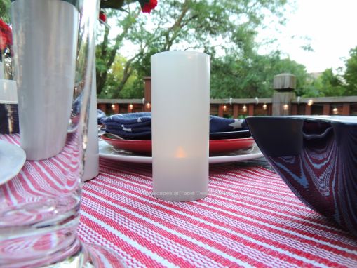 I started this tablescape with a white stretch tablecloth from LinenTablecloth.com to cover the ugly legs of the folding table. The topper is blue and white star tablecloth from LinenTablecloth.com, unfortunately discontinued. To emulate the American flag, I added a red & white striped runner.