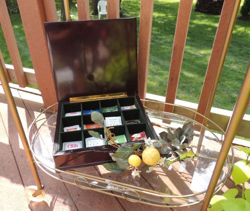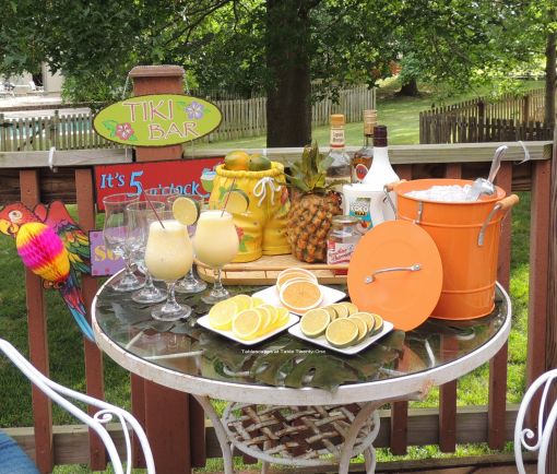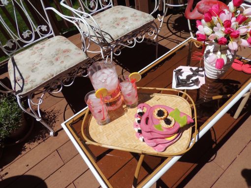 Sips and snacks are set up on a bamboo tray in the seating area. A sweet blog friend gave me these ceramic flamingo appetizer plates a few years ago, and I love them as much today as when I first got them. Thank you, Mona!