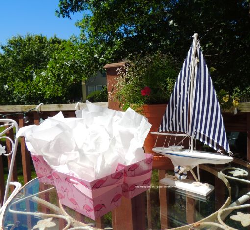 The seating area’s side table is set up with a pot of summer flowers as the backdrop to a blue & white striped sailboat (to mirror the look of the centerpiece on the dining table) and guest favors in flamingo-flecked boxes.