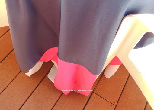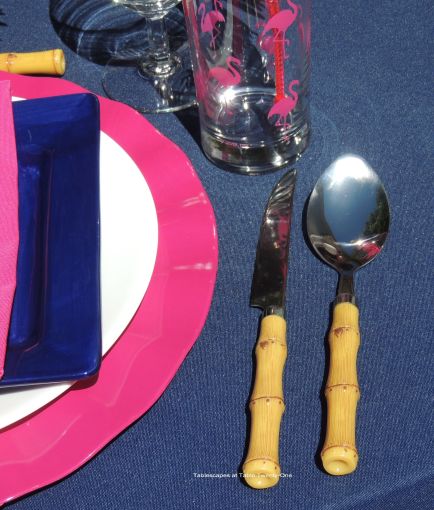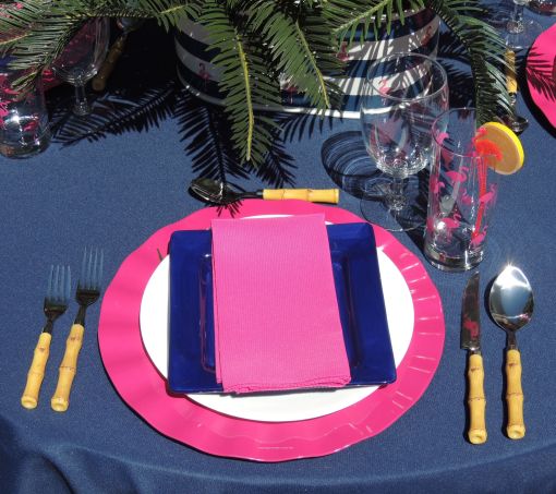 My objective was to set off the bright pink and white against the deep blue. The Crate & Barrel charger for each setting has a bright pink ruffled edge. Plain white dinner plates are offset by navy blue square salad plates from Pier 1. The cotton napkins are from Bed Bath & Beyond, and the faux bamboo flatware is from JC Penney.