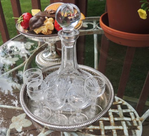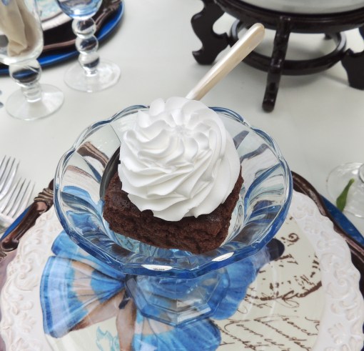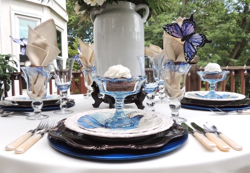 The simple place settings are created by using a white ceramic charger from Old Time Pottery topped with a red dinner plate and square blue salad plate from Pier 1. The napkins, also discontinued at LinenTablecloth.com, complement the tablecloth and are cinched with a shiny red & silver napkin ring from Bed, Bath & Beyond. The flatware is Hampton Silversmith “Patriot” which is one of the most favored patterns in my collection. The graceful crystal pilsner glasses were found at an estate sale.