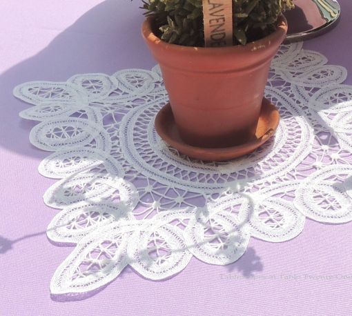 II love my country, but I’m about plumb tuckered out on the red, white and blue for a minute.  This refreshing respite of pink, white and navy blue is just what the tablescaping doctor ordered. The round table for 4 is layered with those very colors from LinenTablecloth.com.