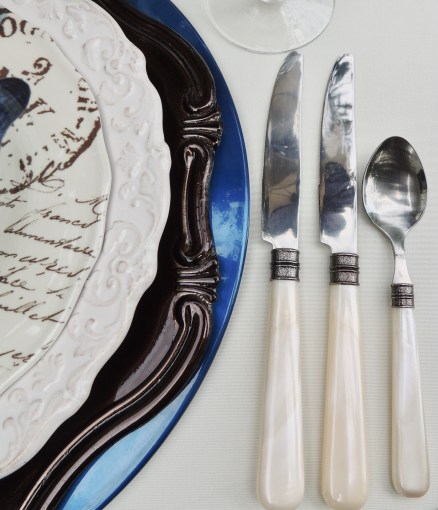 When setting up a buffet table, I like to have various sizes, shapes, textures and anything else available to give the table “motion.” Setting the spoons on the diagonal seem to do just that. The bowls by Rosanna feature a stiletto heel motif. They were purchased at Tuesday Morning some time back.