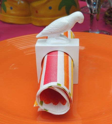 The polyester LinenTablecloth.com napkins in “Caribbean” blue are folded lengthwise and placed with one end beneath the charger. Each napkin is cinched with a colorful beaded napkin ring rescued from the clearance bin at Bed Bath & Beyond 5+ years ago.