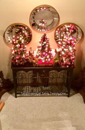 Through the family room door and down the basement stairs is a table with a trio of decorated miniature trees that reflect back in the mirrors above. (I wish these photos were better. This was really just so pretty at night!!!) Standing among the trees is a pair of Father Christmas figurines and gold reindeer.