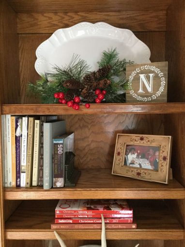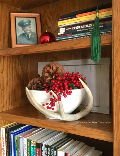 I embellished a lot of the existing decor with faux greenery and red berries. Deer sheds (antlers) placed in or around white ironstone bowls with berry embellishment gives the bookshelves a festive, outdoorsy look. A white ironstone platter from Home Goods is lightly adorned with Christmas greenery, pine cones and berries. Something as simple as plopping a sprig of bright berries and a bit of evergreen into a tiny vase changes the whole look of the shelf with the candlesticks. (That’s my hubby’s Air Force graduation photo. He was such a little cutie…looked like a 12-year-old!)