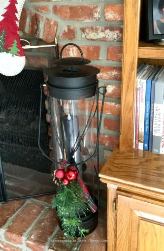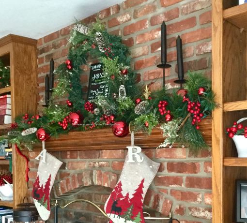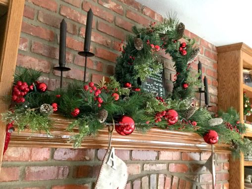 Our fireplace is the focal point of the room despite my husband’s insistence on having a television the size of Montana in the family room. In 2016 I decorated it with lots of faux greenery with sprigs of fresh stuck in here and there, pine cones, red ornaments and berries. Black iron candlesticks with black candles flank the wreath on the mantel, while tall black lanterns rest on the hearth.