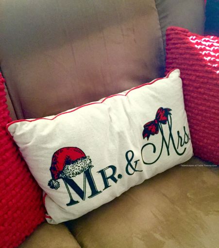 I like to give the family room a fun look that reflects our casual, relaxed lifestyle as a fun-loving couple. Another set of plush animals rests on a miniature park bench beside the hearth. (Other plush animals were beneath the tree in the library as seen here.) Check out how protective he is of her…like Ramon is with me! A lighthearted Mr. & Mrs. Claus lumbar pillow is tossed on the sofa.