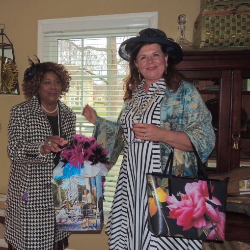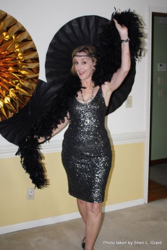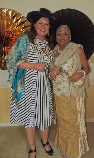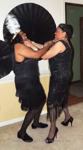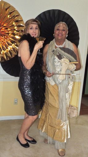 A couple of snappy “sips”: My “tomato” cousin, Dee Evans, and the flapper with the sexy “stilts”, Susan Wilson.