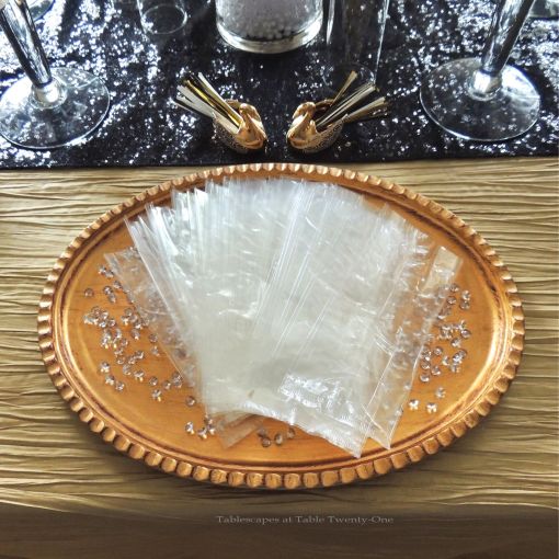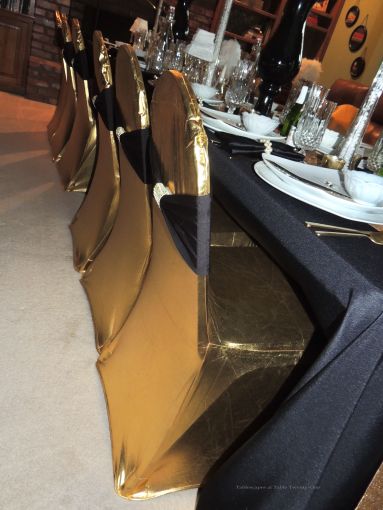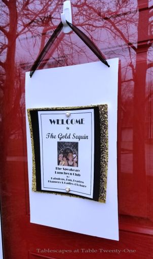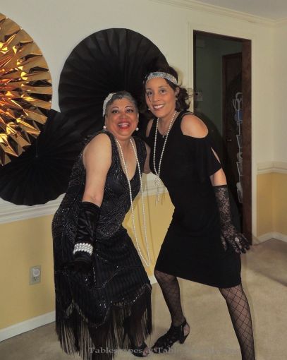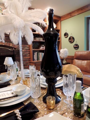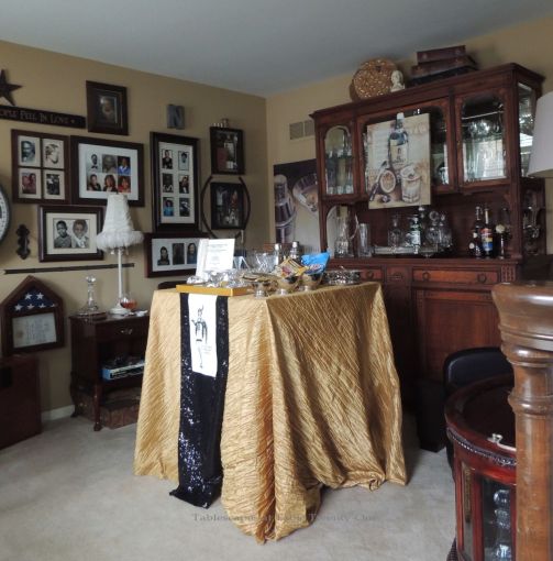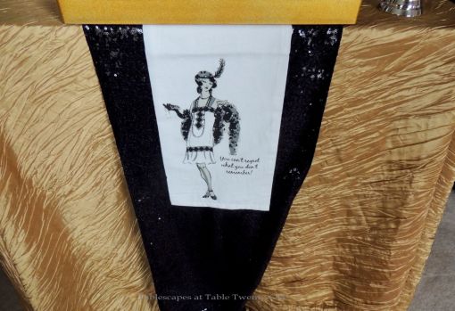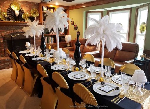 We transformed the family room into a 1920s era fine dining establishment complete with a 1920s music playlist in the background. It didn’t take long for me to know what linens I’d use from my stash. The palette of the Gatsby era was gold, black & white. I layered floor-length (90″x132″ for 6’x30″ folding tables) black linens from LinenTablecloth.com with gold sequin runners from YourChairCovers.com. The chairs clean up nicely with gold stretch leather-look covers (no longer available where I bought them, but I’ve seen them at TableclothsFactory.com) with black spandex sashes and sparkly gold slips (YourChairCovers.com).
