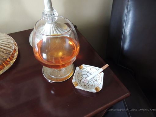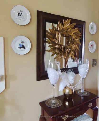 Our modest entry hall sets the tone for thumbing our noses to Prohibition with the oversized champagne flutes! They’re filled with tiny crystals. (Crystals…Cristál…the champagne…get it?) On the walls are cute Rosanna cocktail plates I bought a few years ago for cocktail parties that were first used for “Hooray for Vodka!” back in 2013! (Smaller plates of this same design were used to serve the birthday cake!)