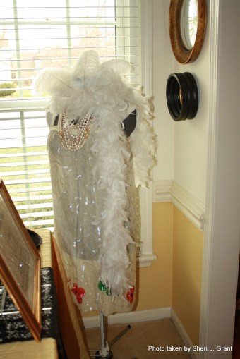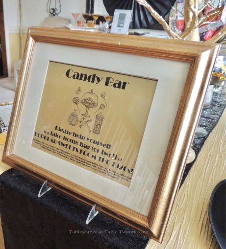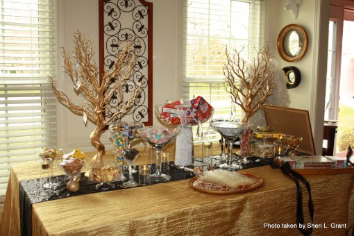 The candy bar in the dining room was one of my favorite elements to create! I researched candies and gums that were popular in the 1920s and then went on the hunt. The result: a favor bar laden with 22 flavor treats served up in various size martini and pilsner glasses!!! Guests scooped up what they wanted into favor bags with black, gold and/or white twist ties displayed in my Limoges swan salt & pepper cellars. The table is covered in another gold crinkle taffeta cloth with a black sequin runner. The gold painted manzanita “trees” just seemed to work with the decor, especially dressed in large hanging crystals. My generous neighbor provided the sequined dress for the dress form, and I finished it off with a few ostrich feathers, a feather boa, and all the remaining pearl necklaces from my jewelry collection!