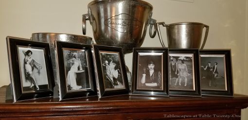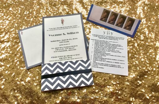Setting the mood from the very start was an important part of the planning. The invitations I created on my desktop had the familiar art deco design representative of the 1920s. Along with the invitations was an insert suggesting accessories to help the ladies get “all dolled up” for the occasion. Notice the flapper lady I put in the return address corner and the Lena Horne stamps!!!