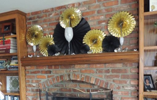 The dining room was “fun central” with the candy bar AND a “photo booth” where guests could take selfies or have their photo taken. We simply took the existing artwork off the wall and replaced it with oversized gold and black paper rosettes (Michaels). I hung a huge paper rosette over the mirror and draped it with crystal garland. The photo prop table beneath was laden with vintage accessories (thanks, Dee!) and fake cocktails. (Notice I was a good girl and stayed in little black flats instead of the gorgeous T-strap heels I really wanted to wear!) Fun/Silly pics of guests at the photo booth and around the house are at the very end of the post. Such fun!!!