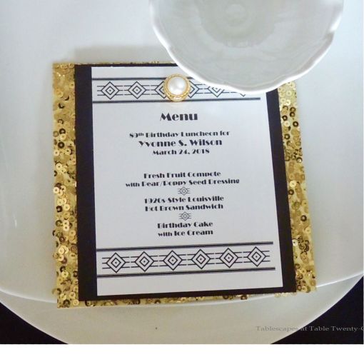 While recuperating from my most recent spine surgery, I planned a 1920s/Gatsby-style ladies luncheon to celebrate my Mom’s 89th birthday. (Doesn’t she look beautiful??? Don’t tell me this chick “Ain’t Misbehavin'”!!!) A grand luncheon in her honor has become sort of a tradition (when I’m healthy!) since her 2011 retirement from the Missouri Senate, and it’s always a delightful challenge to come up with a theme that both she and her guests will enjoy. (Check out 88 Years & 88 Keys, Celebrating 85 Years of Fabulous, Pretty In Pink, Grazin’ in the Grass.) This year’s inspiration came from a flapper bar towel my friend/neighbor, Barbara, gifted me while I was convalescing. Mom was born in the March preceding the start of the Great Depression in 1929, and I thought it would be a fun idea to travel back in time to explore the good things about that (infamous) year!