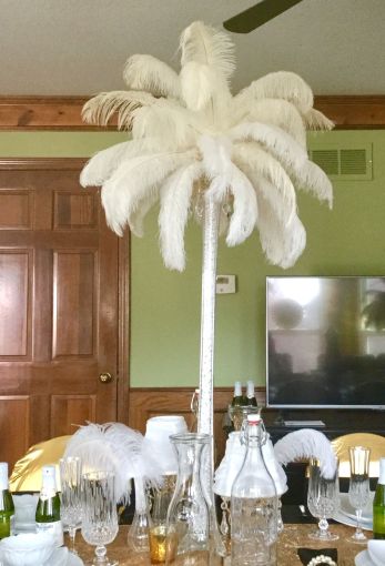Other special touches around this room included another ostrich feather lamp I created using a crystal candlestick, an abundance of paper rosettes (Michaels) mixed with oversized champagne glasses of crystals and pearls, and an extra tall martini glass (Hobby Lobby) that I placed in a large flat glass bowl to give it girth. Final touch: notice a muted television in the background playing “The Great Gatsby” movie!!!