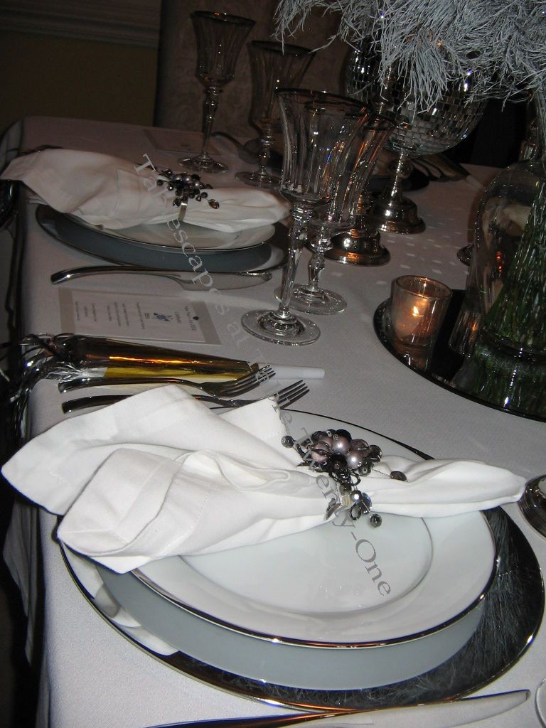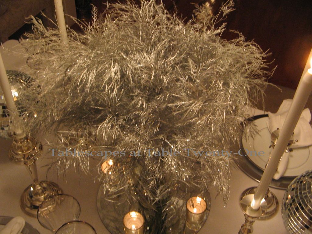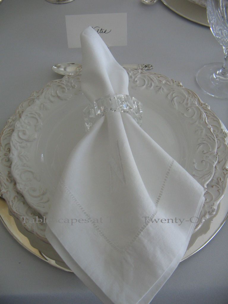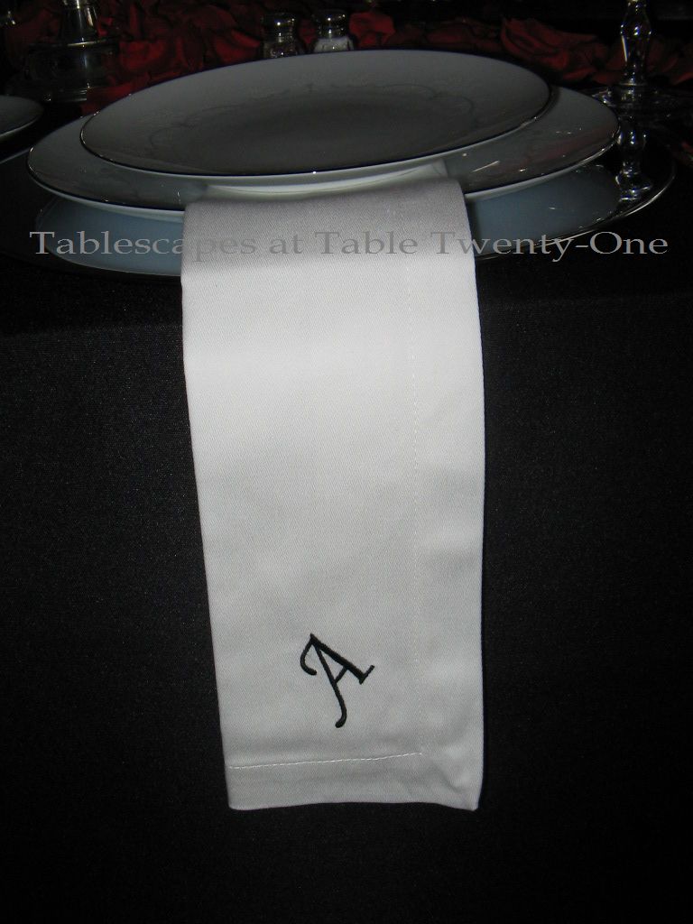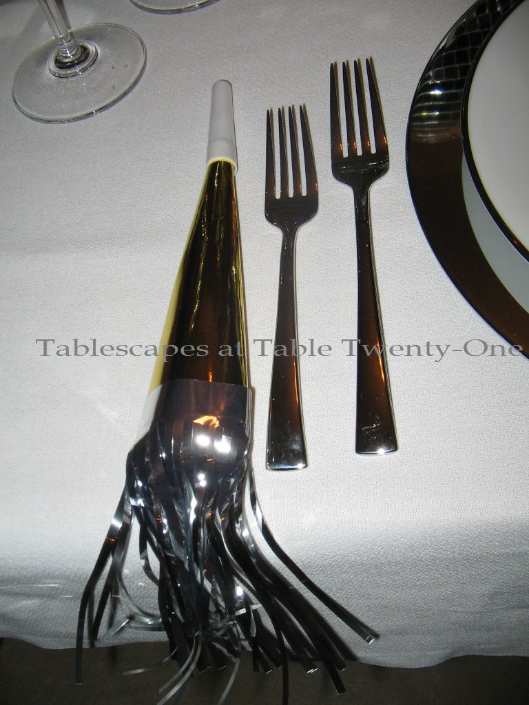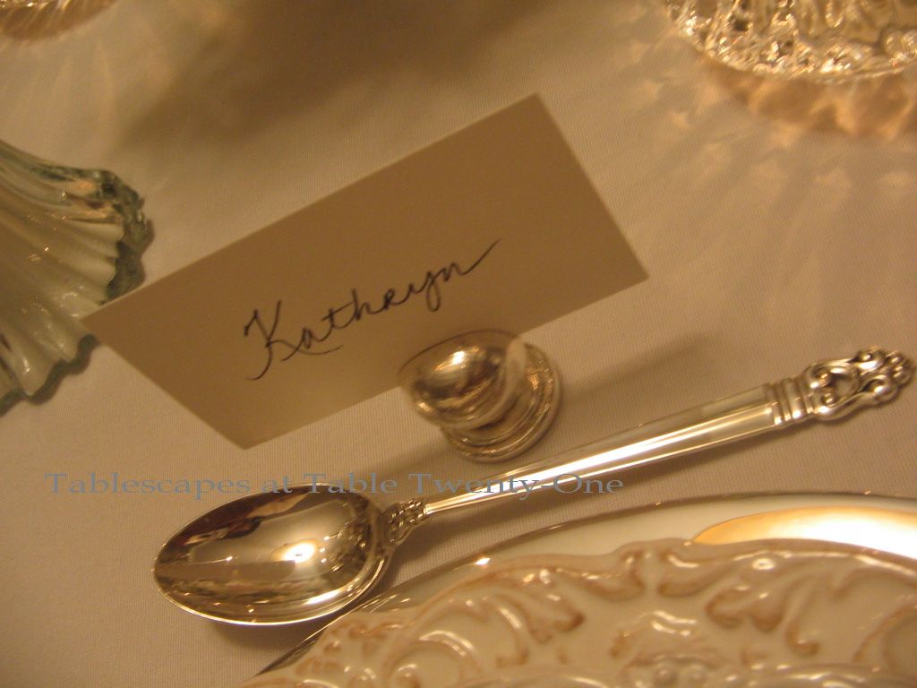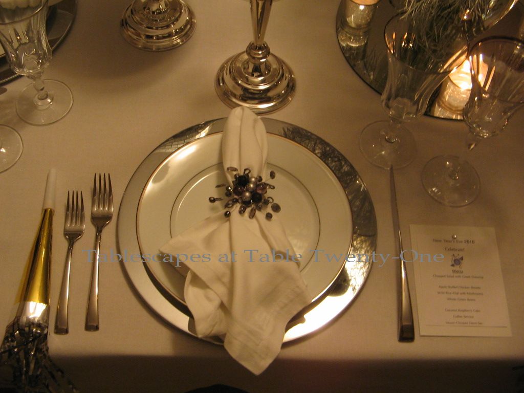 These Pier 1 wine glasses with clear stems supporting an emerald green bowl seemed a perfect representation of the occasion’s prevailing color. The gold design around the rim is similar to that around the china. I bought these stems at the same time I bought these that I used for one of my Mardi Gras tables this year.
