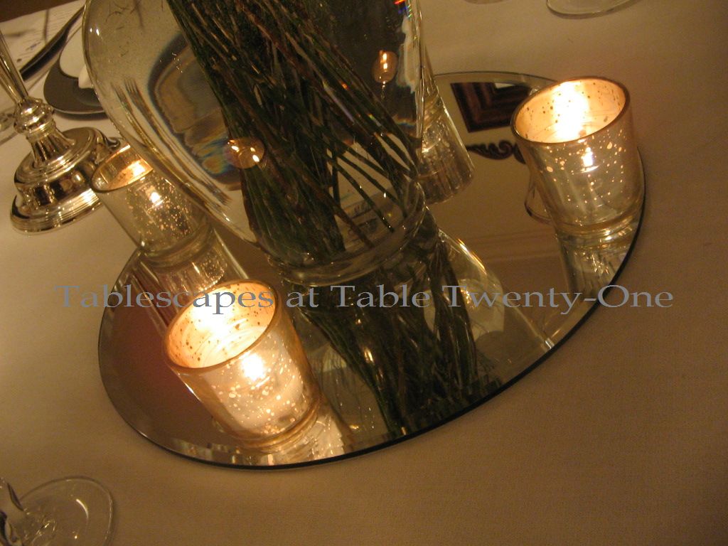 My husband actually suggested that I use these emerald green votives in place of the gold mercury glass ones I had selected. Good goin’, Ramon! It really does work better! Your eye for this stuff is kinda starting to scare me, dude! 😉 I picked these votives up at Old Time Pottery last year.