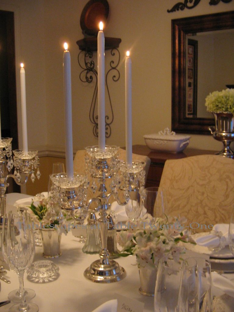 The center of the table is adorned with tall gold candlesticks alternated with simple free-flowing bouquets of Bells of Ireland and orchids. I considered pots of shamrock, but decided on this airy floral combination instead because of the height and tinge of sophistication it lends. Ms. Anonymous, you may want to go with slightly fuller arrangements since you are seating for 8 and have a larger table.
