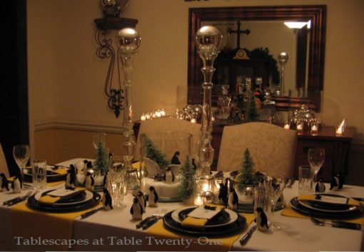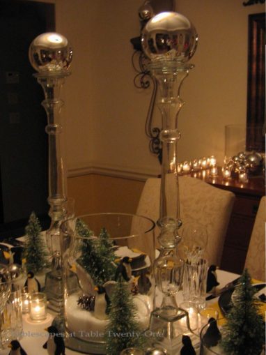 …and the take home favors of assorted popcorn flavors from Popcorn Heaven tucked into black velvet bags and prominently displayed in a large silver compote! (Variations of the compote are at “Finally Fall“, “Cranberry Christmas – Square“, “Cranberry Christmas – Long Table“, and “Roses In October“.)
