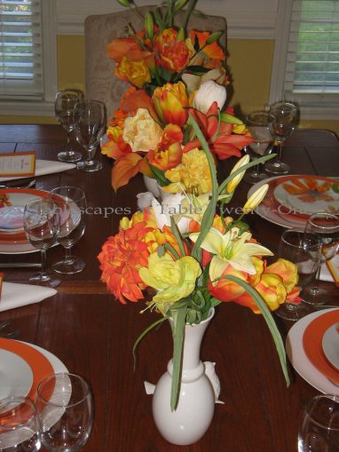 I like for the items on the buffet behind the table to coordinate whenever possible. This time around I used a massive orange wooden platter from Z Gallerie as a backdrop. The pure white pitchers, purchased a couple of years ago at Home Goods, are spruced up with silver beverage tags affixed with mandarin orange ribbon. A jumble of orange, yellow & green beads add color and texture.