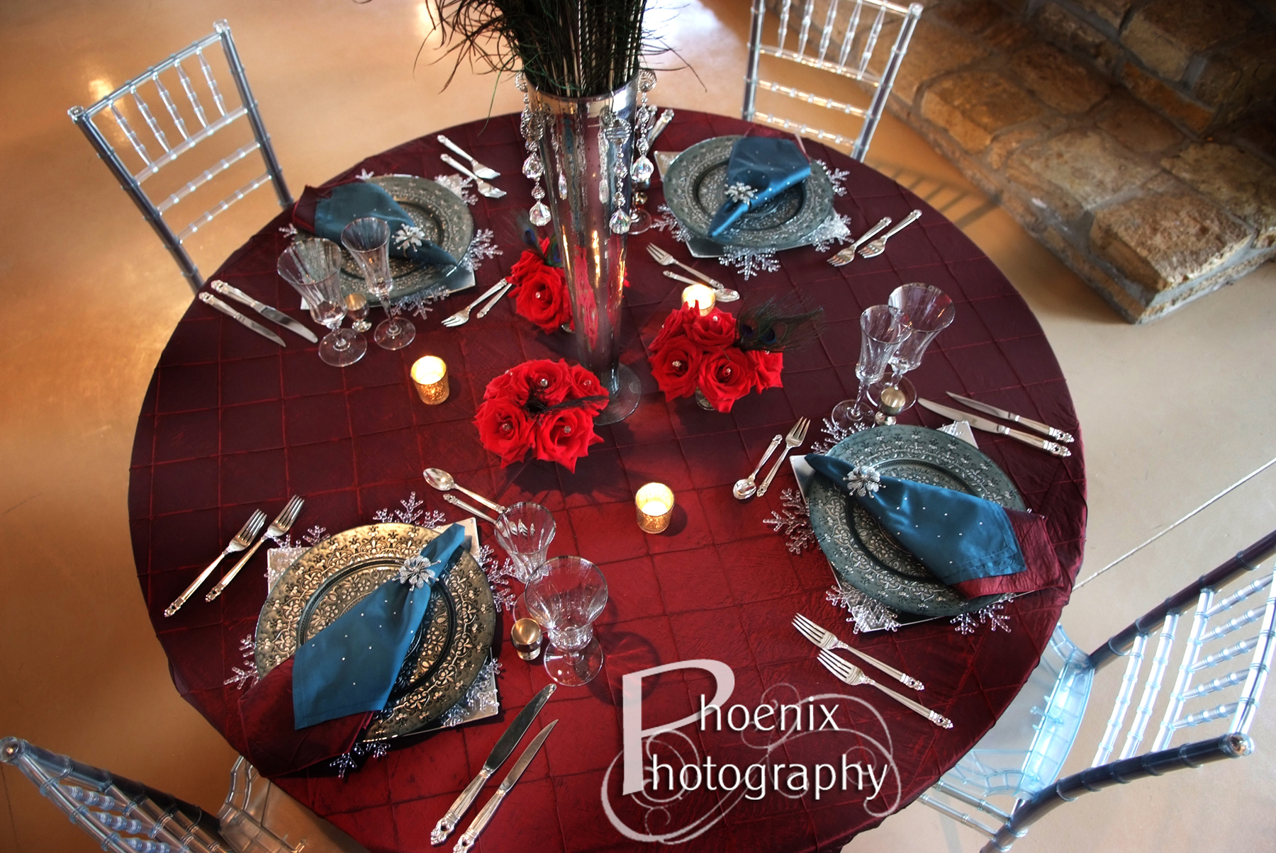 This beautifully-appointed table begins with a 90″ x 132″ soft silver tablecloth from YourChairCovers.com.