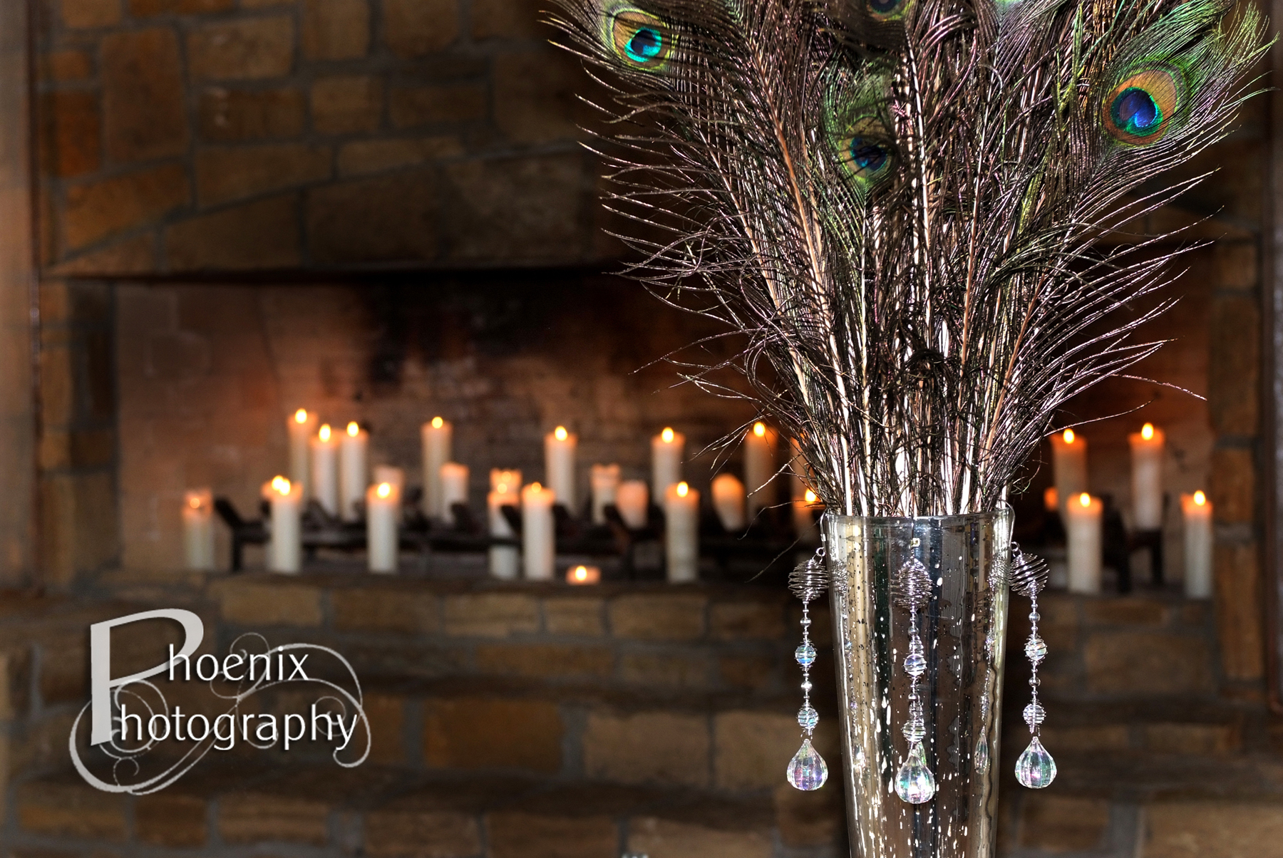 I do love a pretty centerpiece, and this one was several weeks in the making. I just couldn’t decide on the center vase! Finally – after selecting mercury glass votives for the table and buffet – I settled on this gourd-shaped silver mercury glass vase from Hobby Lobby. A scant few peacock feathers rise and drape from it.