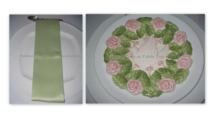 Each place setting starts with a silverplate charger and platinum-rimmed Noritake “Spectrum” dinner and salad plate. A soft pink, simply folded napkin from Bed, Bath & Beyond sits atop the plates. I created the menus on our home computer and gave them more of a 3-D look by adding an actual ribbon dotted with a pink gemstone. (The menu items were our actual dinner that night. You can find my recipe for the chicken pot pie on this site under Recipes. The cake is a wonderful recipe from Kitty’s Kozy Kitchen, and it is decadently delicious!!!)