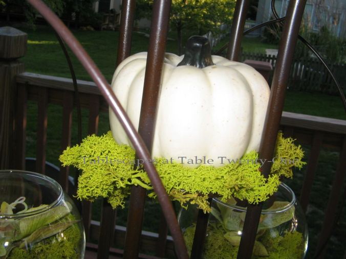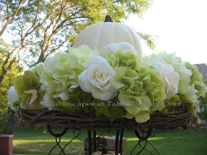 The ugly little spindly legs on the bottom part of the centerpiece are camouflaged with mounds of florals accented with reindeer moss and a white mini pumpkin.