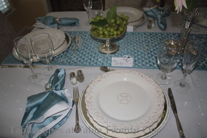 …and the take home favors of assorted popcorn flavors from Popcorn Heaven tucked into black velvet bags and prominently displayed in a large silver compote! (Variations of the compote are at “Finally Fall“, “Cranberry Christmas – Square“, “Cranberry Christmas – Long Table“, and “Roses In October“.)