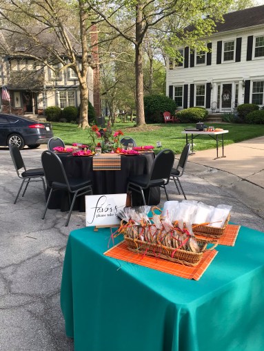 I set up a table for 6 in front of our house for us who are fully vaccinated. We all routinely socialize, so it was nice to be able to sit together after a full year of separation! Inspiration for the tablescape came from the fancy hand painted rooster glasses I recently purchased at a friend’s yard sale. Eight of them for just $10!!! Add orange Dollar Tree plates, Cambridge “Esben Beachwood” flatware, a couple of colorful crisscrossed runners, and a rooster to the table’s center flanked by succulents and (faux) Gerbera daisies…and voila!